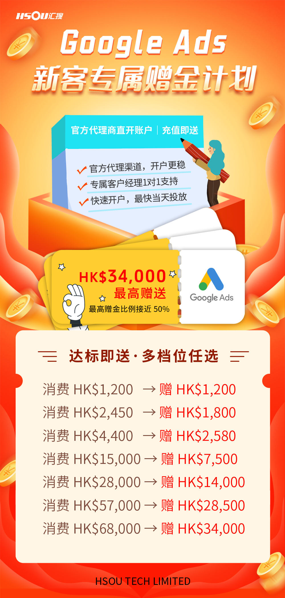 做跨境/独立站/外贸的老板/运营 官方代理商直开Google Ads账户,新客专属赠金直接拉满,最高能领3.4W港币,比例接近50%,等于花一半预算拿双倍流量,这波羊毛必须薅!✅ 官方代理渠道,账户稳不踩风控,告别自开关联风险