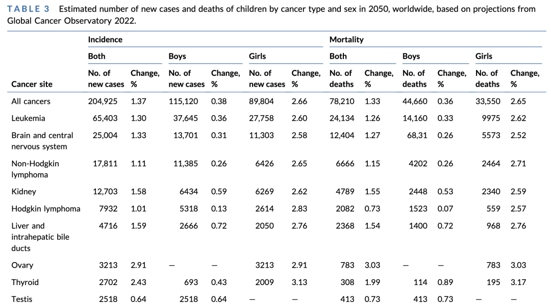 [1]Li, Wangzhong, Shanzhou Huang, Qiyue Chen, et al. “Global Cancer Statistics for Children: Two Decades of Change and Projections to 2050.” CA: A Cancer Journal for Clinicians 76, no. 2 (2026): e70069. https://doi.org/10.3322/caac.70069.