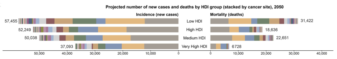 不仅如此,根据研究团队的预测,到 2050 年,这种不平等仍将进一步扩大。在低 HDI 的国家中,儿童癌症负担将会表现出「高发病、高死亡」的特点,而极高 HDI 的国家则会是「低发病、低死亡」。