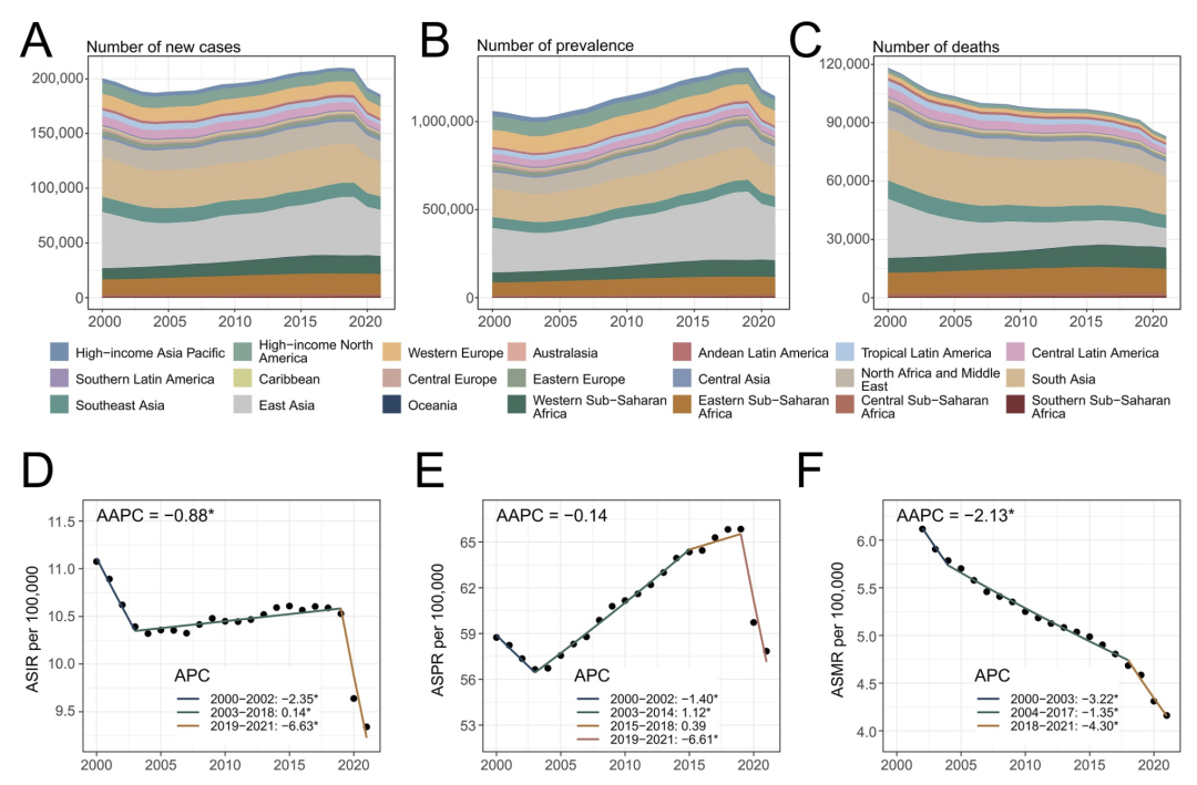 从 2000 年到 2021 年,全球儿童癌症的新发病例数和现患病例数都呈现出一种「先下降、后上升、再下降」的趋势,而死亡人数则整体呈现持续下降的趋势。