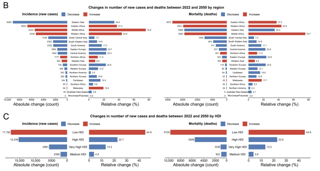 根据研究团队的预测,与 2022 年相比,2025 年中等 HDI 国家、高 HDI 国家和极高 HDI 国家的儿童癌症发病数和死亡数都会下降,只有在低 HDI 国家中,儿童癌症的发病数和死亡数仍然有大幅度增长,增长的比例都接近 50%(发病数增长 44.9%,死亡数增长 44.8%)。