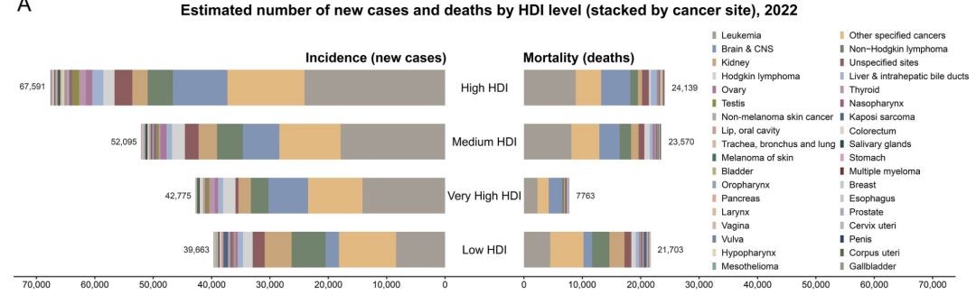 在 2022 年,低人类发展指数(HDI)国家的儿童癌症负担呈现出「低发病、高死亡」的特点,而极高 HDI 国家则发病数更高但死亡数更低。