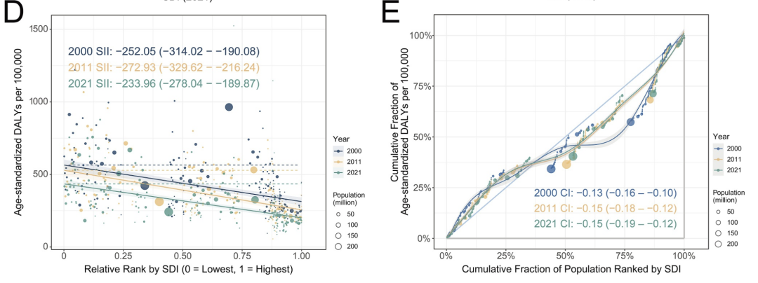 总体而言,在 2000 年、2011 年和 2021 年,全球儿童癌症负担主要集中在低社会人口学指数(SDI)的国家,而且随着时间的推移,这种不平等正在扩大。